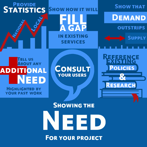 Speaking to your users or local community about what they need is a great way to show why your project as a whole is needed. It can also help you shape the project before you apply, so that you best meet their needs. This can be anything from a small informal survey to a large scale community consultation. It’s also a good way to show demand, gain learning, and even generate your own statistics to back up your application.