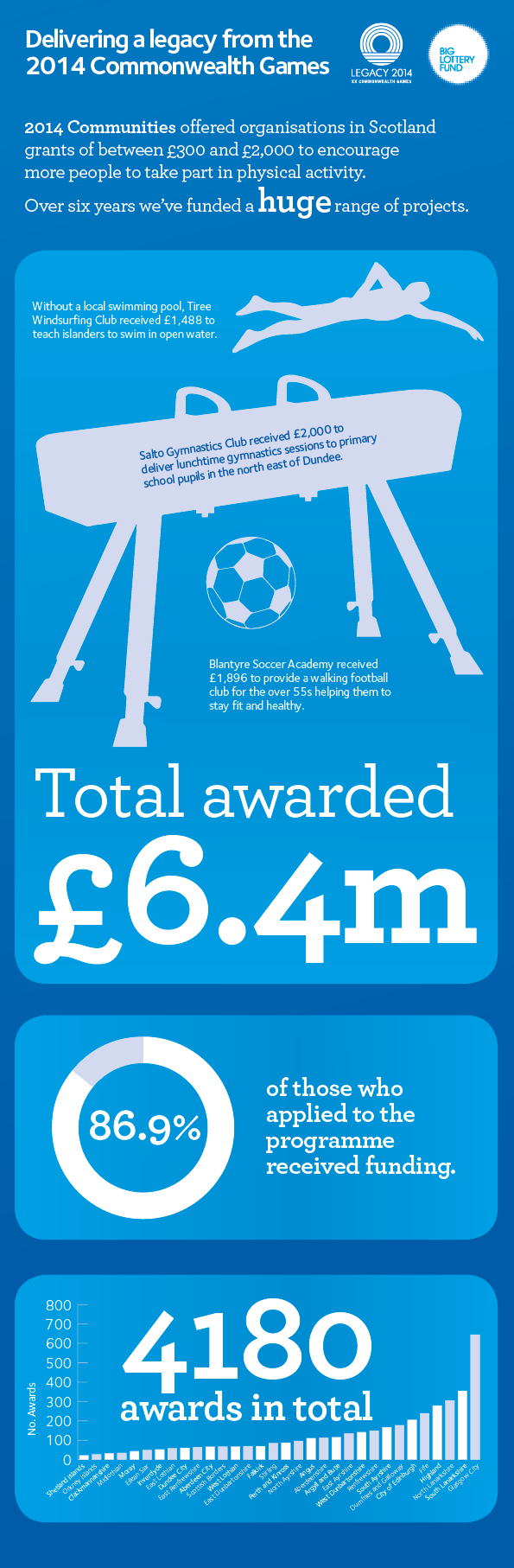 It was the first dedicated fund in Scotland aimed at creating a lasting legacy from the Glasgow 2014 Games and today, six years on, 2014 Communities makes its final awards. Since 2008 we’ve awarded £6.4 million to 4,180 projects that support grass roots involvement in sport and physical activity – with funding going to every one of Scotland’s local authorities.