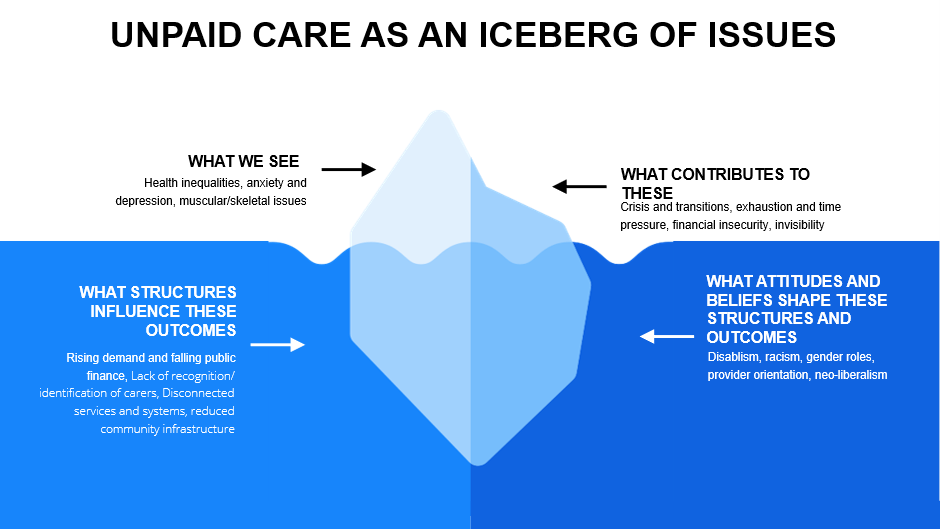 To explain what we mean by systems change, we use the iceberg model (pictured above). This model helps us to understand what drives health outcomes for unpaid carers and where change can make the biggest impact. The iceberg model (Figure 1) has four levels: